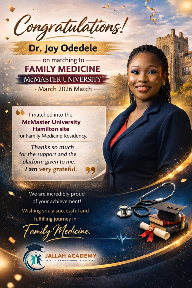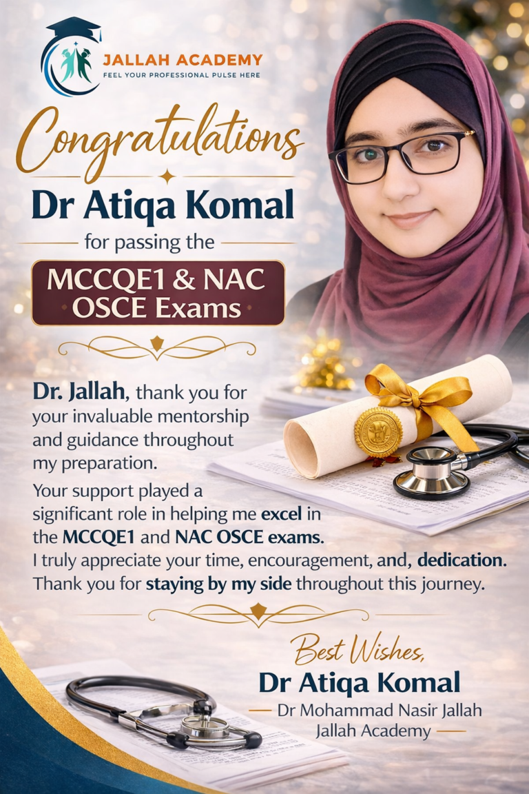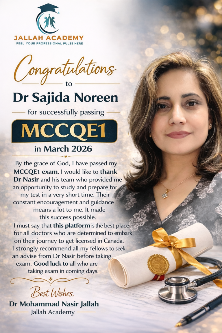 Jallah Academy expertly guides medical professionals through Canadian medical licensure, with proven success in MCCEE and NAC OSCE preparation. We help aspiring doctors meet Canada’s highest medical standards.