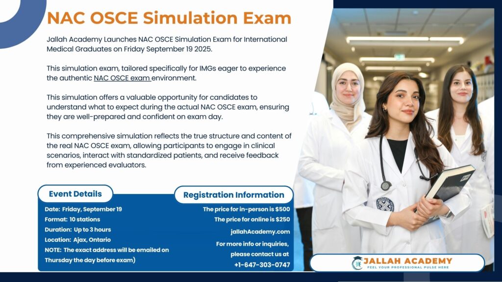 Jallah Academy proudly presents the NAC OSCE Simulation Exam, carefully designed to mirror the official Medical Council of Canada Qualifying Examination. Whether you are an International Medical Graduate (IMG) or a Canadian medical graduate, this is your chance to practice under real exam conditions and sharpen your readiness.